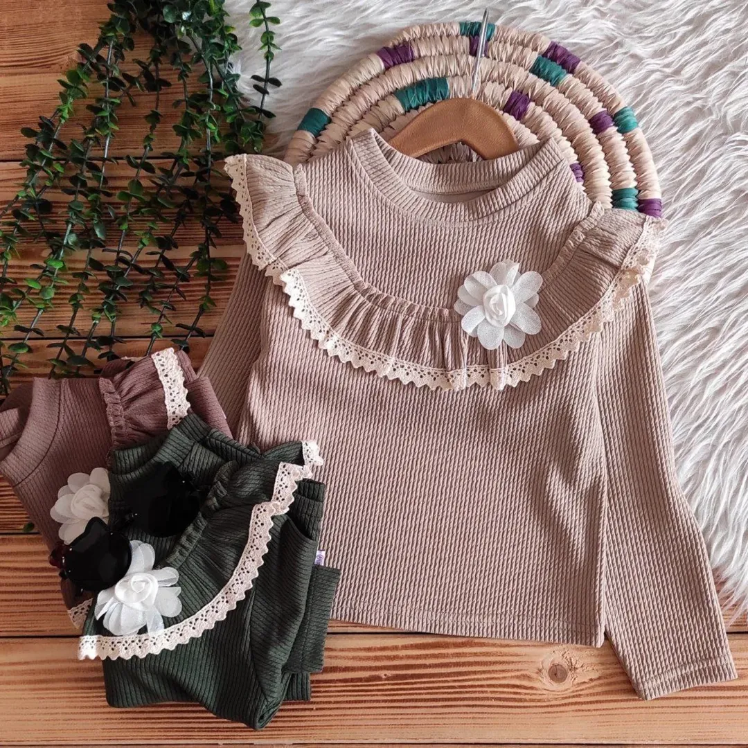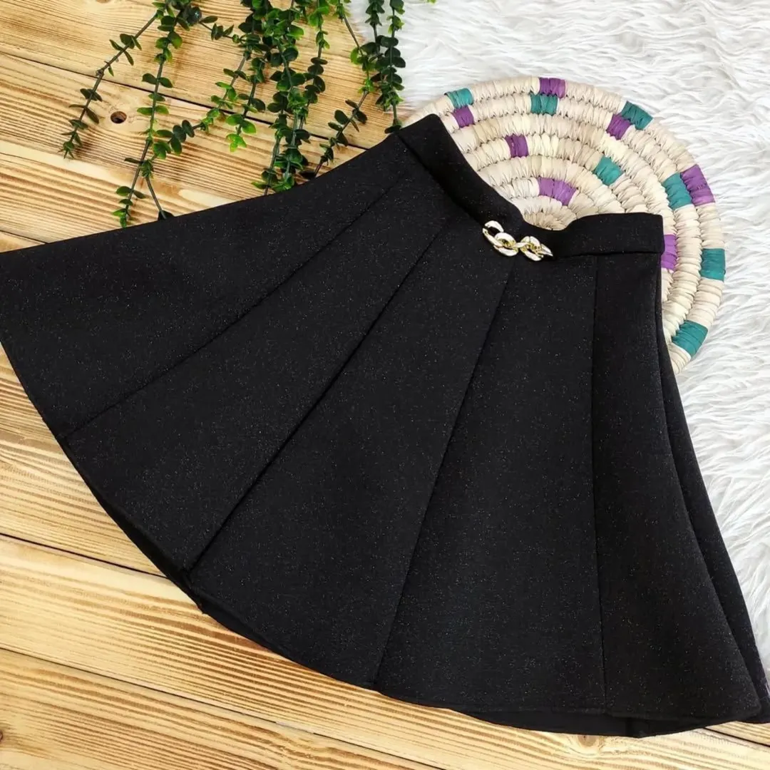 بلوز جنس کبریتی کشی مناسب 3 تا 8 سال، دامن جذاب لمه ساندویچی شاین با کمر کشی و دکمه تنظیم.