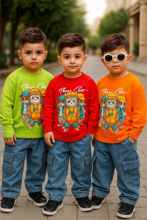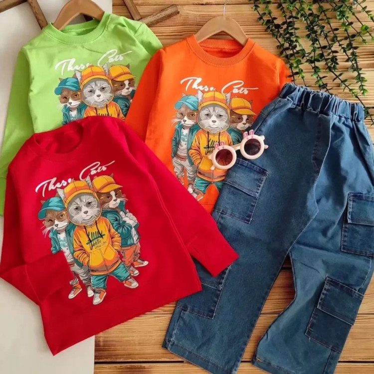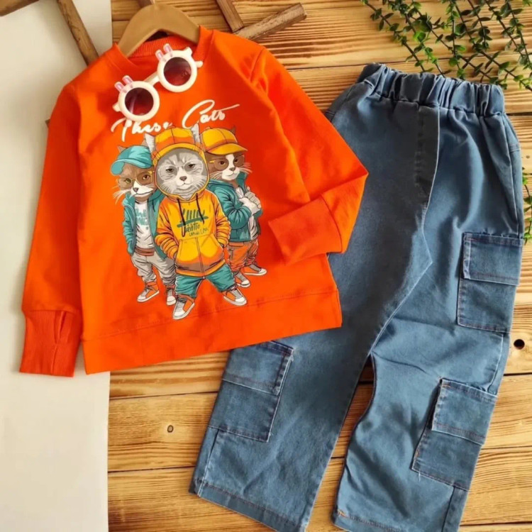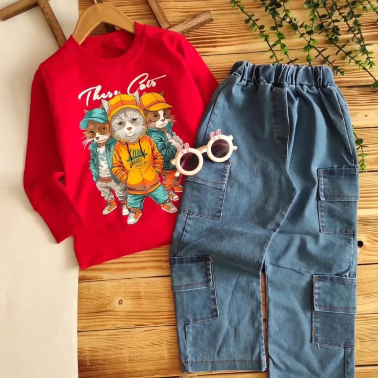 بهترین کیفیت بلوز اسلپ با چاپ و شلوار لی کارگو درجه یک. مناسب برای سنین 2 تا 10 سال.