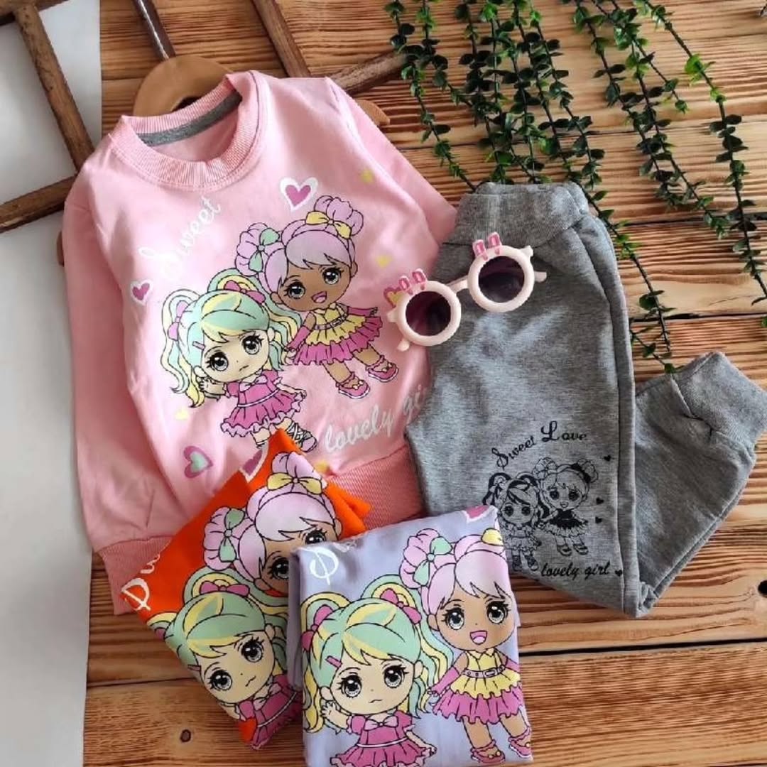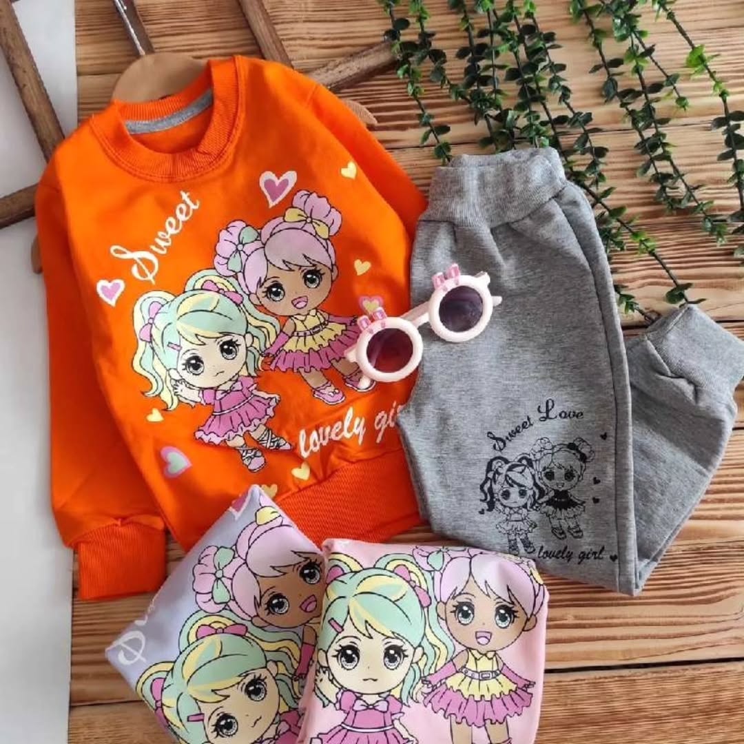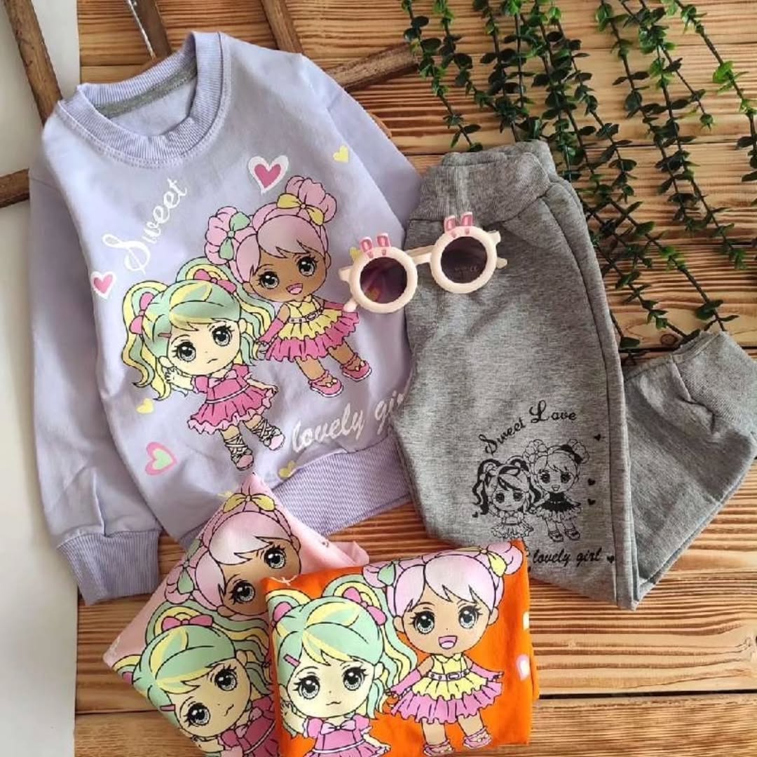 ست دخترانه شامل بلوز دورس عالی با چاپ با کیفیت و شلوار ملانژ پنبه. طراحی مناسب برای سنین ۳ تا ۹ سال با جزئیات سایز و قد مشخص.